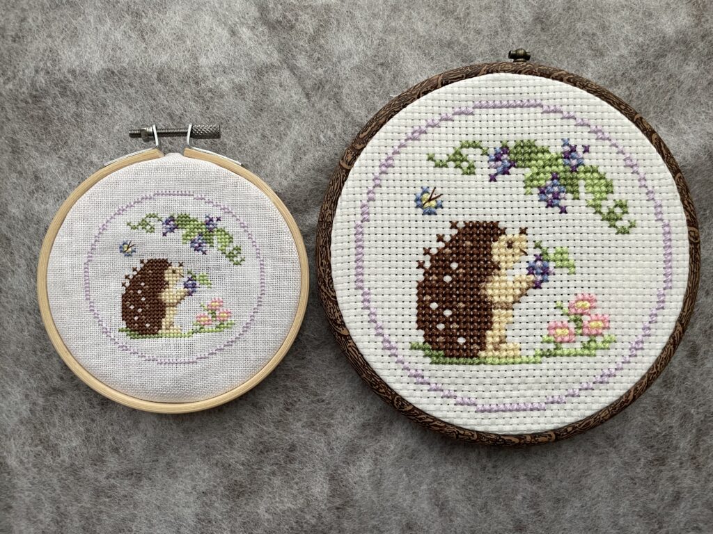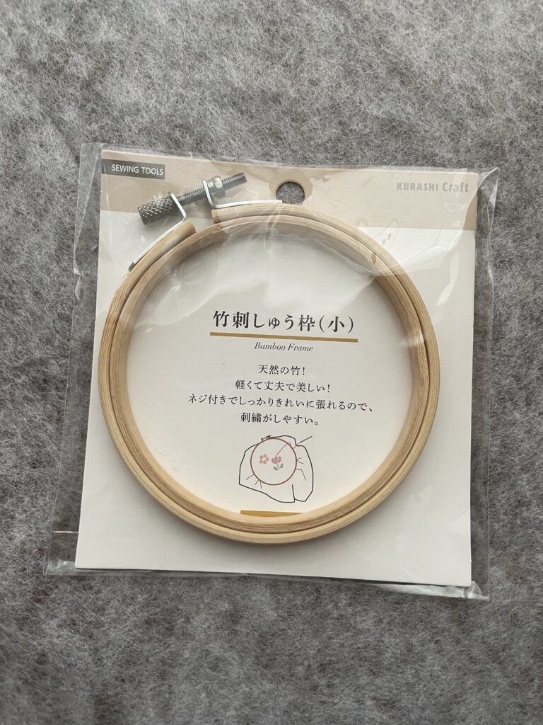 わたしは32ctで刺しているので(16ctと同じサイズになります)、100円ショップのセリアの11cmの竹刺しゅう枠(小)に入れました。
